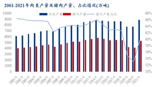 圖2 2001-2021年肉類產(chǎn)量及豬肉產(chǎn)量、占比情況
