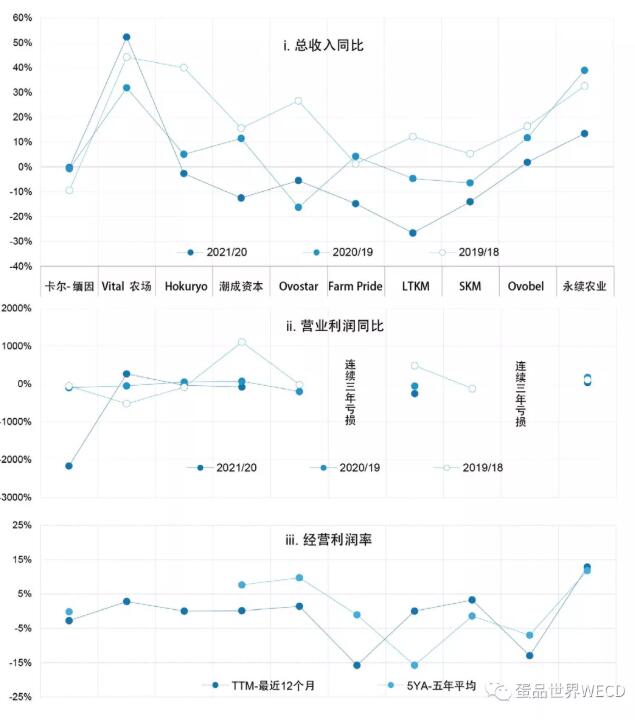 新冠疫情大流行以來,全球蛋雞生產(chǎn)上市企業(yè)前十強中,多數(shù)企業(yè)在2021/20年度總收入同比出現(xiàn)負增長,較疫情前的2019年和2018年均出現(xiàn)明顯下降;營業(yè)利潤、經(jīng)營利潤率也出現(xiàn)類似特征但較營收下降幅度不太明顯,連續(xù)3年虧損的Farm Pride食品公司、Ovobel 食品公司同期虧損幅度進一步加大;比較來看,另外10家上市企業(yè)2021/20年度的總收入、營業(yè)利潤、經(jīng)營利潤率波動幅度整體不太明顯。