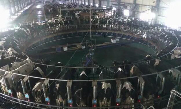 新疆呼圖壁種牛場的一間擠奶大廳里,奶牛整齊排列在轉盤式擠奶機上擠奶。(新華社記者張嘯誠 攝)