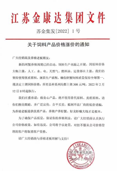 江蘇金康達(dá)集團(tuán)表示,因原料價(jià)格上漲,為了確保蝦蟹料質(zhì)量,自2月12日起,公司所有飼料產(chǎn)品均將上調(diào)300元/噸。