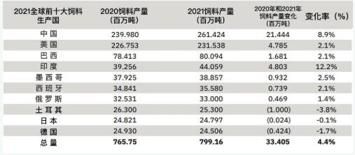 全球前十大生產(chǎn)國(guó)飼料產(chǎn)量共計(jì)7.99億噸,同比去年增長(zhǎng)4.4%,中國(guó)仍然是全球最大的飼料生產(chǎn)國(guó),其產(chǎn)量為2.61億噸,而且實(shí)現(xiàn)了2020年以來(lái)最大的增長(zhǎng);