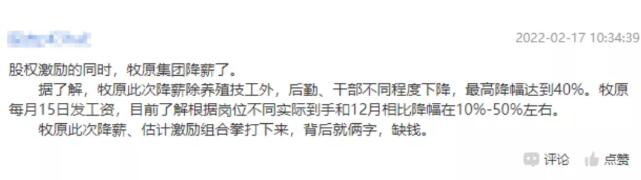 不過(guò)在2月19日,牧原股份在深交所“互動(dòng)易”平臺(tái)回答投資者提問(wèn)時(shí)稱:網(wǎng)傳“公司普遍降薪10%-40%”屬不實(shí)信息。