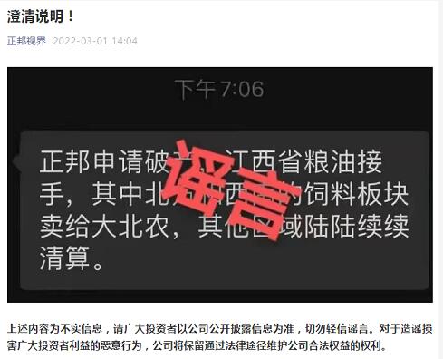 3月1日,正邦集團(tuán)發(fā)布澄清說明稱,關(guān)于公司“申請破產(chǎn)”等相關(guān)內(nèi)容為不實(shí)信息,請廣大投資者以公司公開披露信息為準(zhǔn),切勿輕信謠言。對于造謠損害廣大投資者利益的惡意行為,公司將保留通過法律途徑維護(hù)公司合法權(quán)益的權(quán)利。