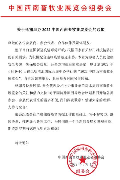 關于延期舉辦(2022)中國西南畜牧業(yè)展覽會的通知