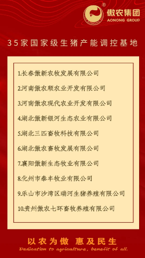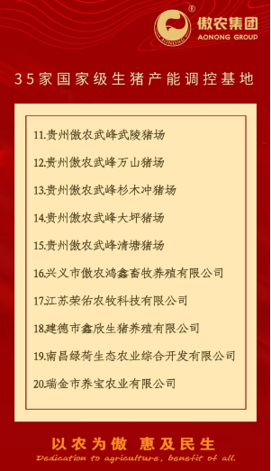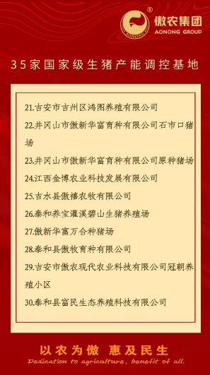 ?? 為進(jìn)一步積極響應(yīng)國(guó)家政策號(hào)召,促進(jìn)生豬產(chǎn)業(yè)持續(xù)健康發(fā)展,確保豬肉供應(yīng)安全有保障,傲農(nóng)集團(tuán)按照豬場(chǎng)自愿加入并配合開(kāi)展產(chǎn)能調(diào)控的原則,建立生豬產(chǎn)能調(diào)控基地。日前,傲農(nóng)集團(tuán)共有35家子公司入選為國(guó)家級(jí)生豬產(chǎn)能調(diào)控基地,8家子公司入選為省級(jí)生豬產(chǎn)能調(diào)控基地。