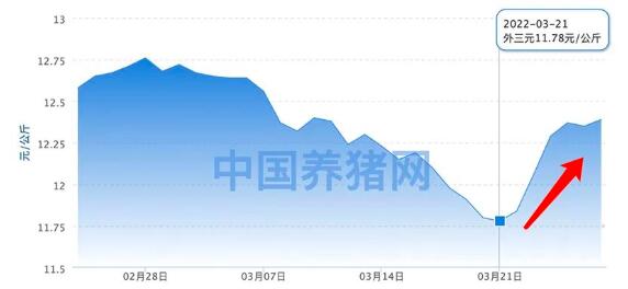 中國養(yǎng)豬網(wǎng)最新數(shù)據(jù)顯示,3月21日至3月27日,生豬(外三元)價格從11.78元/公斤漲至12.39元/公斤,漲幅超過5%。