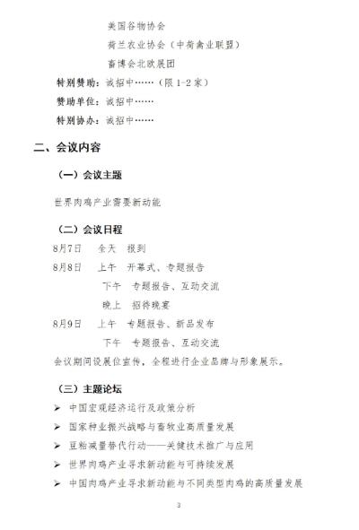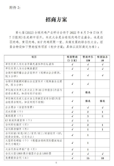 根據(jù)當(dāng)前全國新冠肺炎疫情形勢和成都市人民政府關(guān)于加強(qiáng)新冠肺炎疫情的防控工作部署要求,經(jīng)大會組委會研究決定,原定于2022年5月15-17日(15日報(bào)到)在成都市渝江飯店召開的第七屆(2022)全球肉雞產(chǎn)業(yè)研討會延期至2022年8月7-9月(7日報(bào)到),會議地點(diǎn)及內(nèi)容不變,詳見附件。我們將繼續(xù)開展會議的招商工作,請有意向的企業(yè)及時(shí)與我們聯(lián)系。