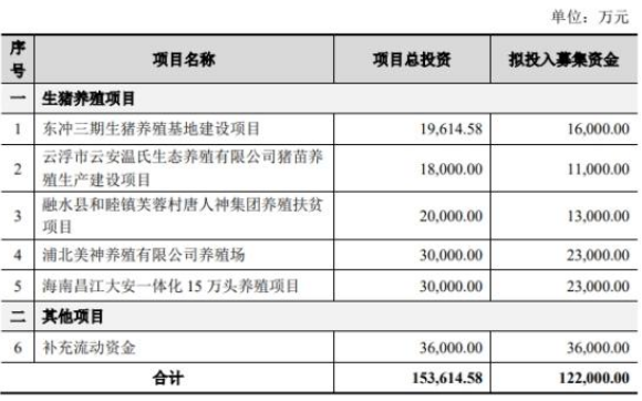 扣除相關(guān)發(fā)行費用后,唐人神擬將募集資金凈額分別用于東沖三期生豬養(yǎng)殖基地建設(shè)項目、云浮市云安溫氏生態(tài)養(yǎng)殖有限公司豬苗養(yǎng)殖生產(chǎn)建設(shè)項目、融水縣和睦鎮(zhèn)芙蓉村唐人神集團養(yǎng)殖扶貧項目、浦北美神養(yǎng)殖有限公司養(yǎng)殖場、海南昌江大安一體化15萬頭養(yǎng)殖項目、補充流動資金。