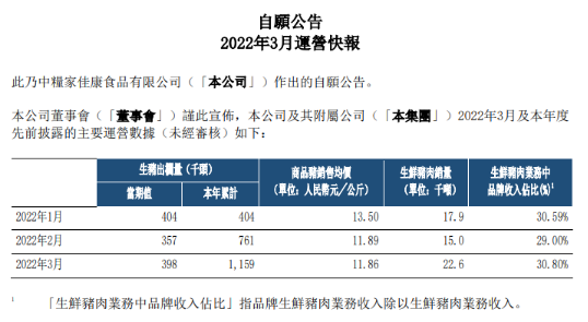 中糧家佳康4月12日公布2022年3月運(yùn)營快報(bào)。公司3月生豬出欄量39.8萬頭;商品豬銷售均價(jià)人民幣11.86元/公斤,生鮮豬肉銷量2.26萬噸,生鮮豬肉業(yè)務(wù)中品牌收入占比為30.80%。