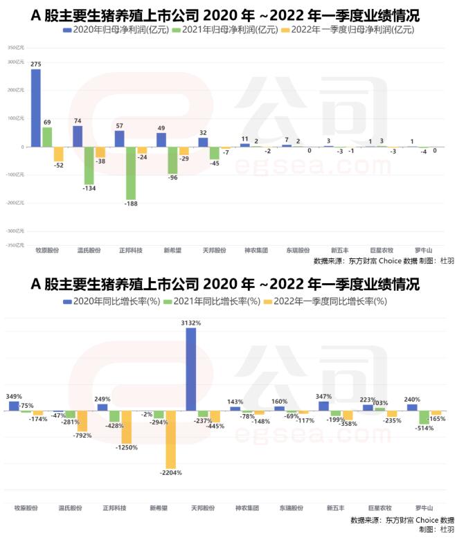 2021年,Wind申萬行業(yè)類生豬養(yǎng)殖板塊10家上市公司中,6家上市豬企已合計(jì)虧損近350億元。而到了今年一季度,去年仍盈利的牧原股份也虧損52億元,板塊中10家上市豬企已合計(jì)虧損超150億元。行業(yè)進(jìn)入隆冬。
