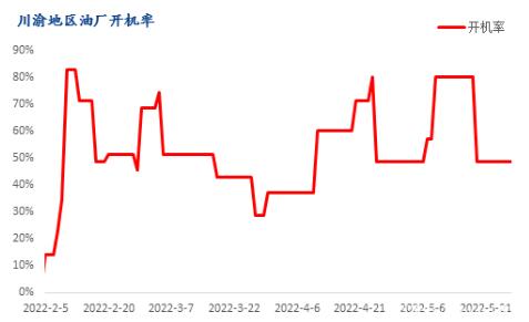 據(jù)Mysteel農(nóng)產(chǎn)品初步統(tǒng)計,2022年5月份川渝地區(qū)油廠進口大豆預(yù)計到港32萬噸,實際已到港23萬噸。截止2022年5月24日,川渝地區(qū)油廠開機率上升至61%,較4月平均52%的開機率有所回升,本月開機率環(huán)比上漲9%。伴隨著大豆到港增加,大豆供應(yīng)得以提升,油廠開機率提高,大豆壓榨量繼續(xù)攀升,豆粕供應(yīng)將逐步轉(zhuǎn)向中性偏寬松狀態(tài)。