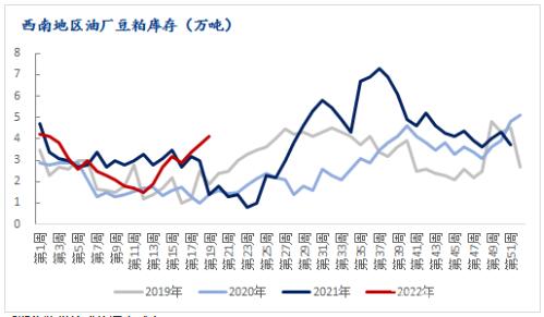 據(jù)Mysteel數(shù)據(jù)顯示,截止2022年5月24日川渝油廠豆粕庫存為4.1萬噸,較上月增加1.4萬噸,同比去年增加2.7萬噸。從數(shù)據(jù)來看,大豆到港增加,油廠壓榨量提升,豆粕庫存持續(xù)上升,已創(chuàng)往年同期新高,雖不能說有累庫情況,但豆粕庫存逐步高企,對市場供應(yīng)壓力降持續(xù)增加。加之飼料需求并未好轉(zhuǎn),使得川渝地區(qū)豆粕價格繼續(xù)承壓走弱。5月中后地區(qū)開機持續(xù)上升,但成交較弱,豆粕庫存逐步增加,中旬后隨油廠開機率一度提高至80%,使大豆壓榨量增加,豆粕庫存庫存壓力不斷加持。