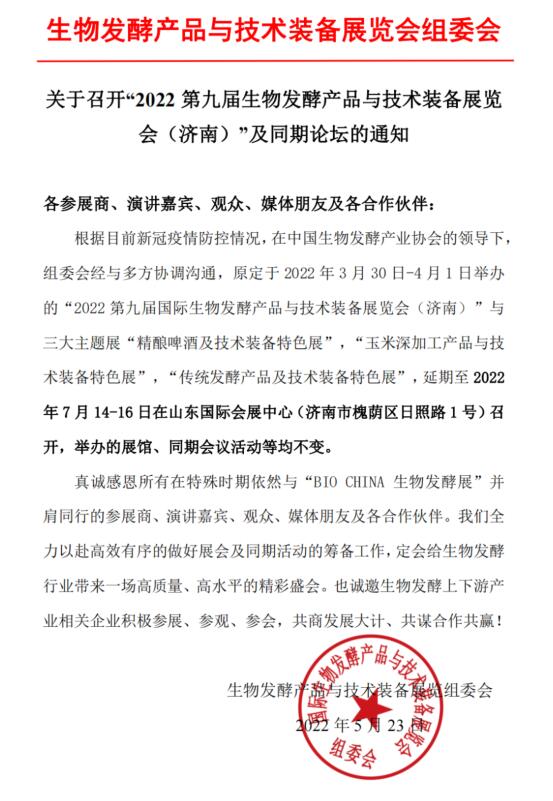 關(guān)于召開“2022第九屆生物發(fā)酵產(chǎn)品與技術(shù)裝備展覽會(huì)(濟(jì)南)”及同期論壇的通知