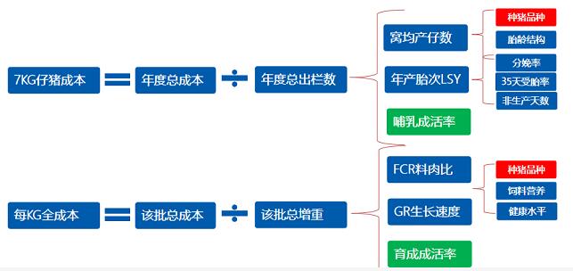 要回答“如何從源頭降本?”這個(gè)問題,我們得先了解養(yǎng)殖成本構(gòu)成。我們以7Kg斷奶成本舉例,圖1為一個(gè)普通企業(yè)的養(yǎng)殖成本構(gòu)成。從(7kg斷奶成本=豬場支出總額÷提供的7kg合格斷奶頭數(shù))的計(jì)算邏輯來看,需要我們想方設(shè)法的增大分母(PSY),降低分子(豬場支出總額)。因此,降本的核心邏輯是:先增效,其次才是降本。