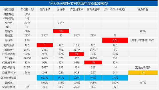 我們知道,育種是唯一可以不斷改善豬生產(chǎn)性能的手段,那育種具體能為降本增效帶來哪些量化價(jià)值呢?從繁殖性能來看,通過下圖1200頭母豬關(guān)鍵環(huán)節(jié)對豬場年度貢獻(xiàn)率模型分析,產(chǎn)仔數(shù)對于增量的貢獻(xiàn)率達(dá)到68.4%,管理措施占31.6%,所以母系選擇高繁殖力的種豬是最好的決策。