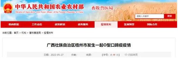 農(nóng)業(yè)農(nóng)村部網(wǎng)站5月27日消息,農(nóng)業(yè)農(nóng)村部接到中國動物疫病預(yù)防控制中心報告,經(jīng)廣西壯族自治區(qū)動物疫病預(yù)防控制中心確診,梧州市長洲區(qū)一屠宰場發(fā)生O型口蹄疫疫情,同群生豬454頭,發(fā)病21頭。發(fā)現(xiàn)疫情后,當(dāng)?shù)亓⒓窗凑沼嘘P(guān)預(yù)案和防治技術(shù)規(guī)范要求做好疫情處置工作。