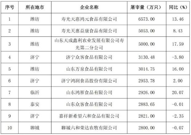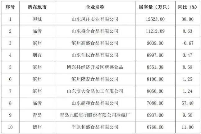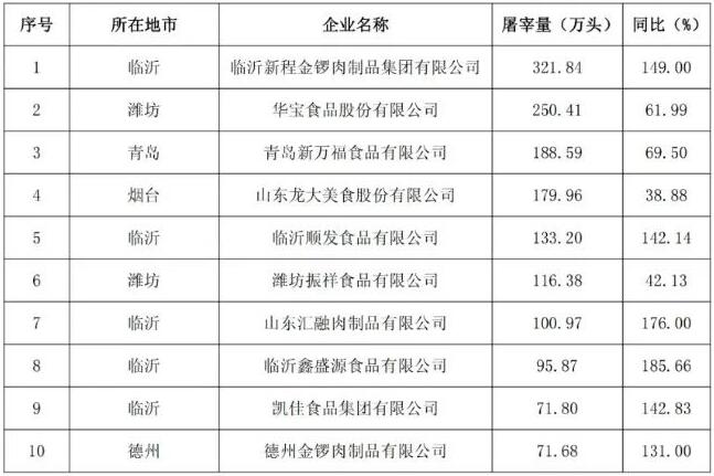 根據(jù)山東省畜牧獸醫(yī)局發(fā)布的《2021年山東省畜禽屠宰行業(yè)形勢發(fā)展報告》,2021年山東省屠宰產(chǎn)量前6名的地市分別是臨沂、濰坊、聊城、濱州、德州、煙臺,屠宰量分別占全省屠宰量的27.10%、16.77%、11.39%、10.13%、6.57%、6.45%,6市年屠宰量均超過100萬噸,合計1279.96萬噸,占全省屠宰量的78.41%。