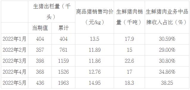 中糧家佳康6月10日公布2022年5月運營快報。公司5月生豬出欄量43.6萬頭;商品豬銷售均價人民幣14.95元/公斤,生鮮豬肉銷量1.83萬噸,生鮮豬肉業(yè)務中品牌收入占比為38.25%。