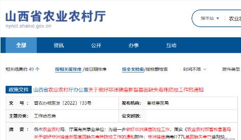 通知表示要落實(shí)《農(nóng)業(yè)農(nóng)村部畜牧獸醫(yī)局關(guān)于做好非洲豬瘟新型基因缺失毒株防控工作的通知》(農(nóng)牧便函〔2022〕438號)要求,防范非洲豬瘟國外I177L基因缺失疫苗(以下簡稱“基因缺失疫苗”)流入山西省。