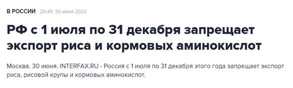 全球糧食局勢(shì)再添緊張情緒。據(jù)央視新聞,俄羅斯農(nóng)業(yè)部于當(dāng)?shù)貢r(shí)間6月30日發(fā)表聲明稱,從7月1日至12月31日,俄羅斯將暫時(shí)限制出口氨基酸飼料和大米。