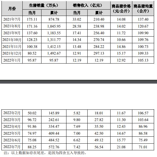 2022年1-7月,公司累計(jì)銷售生豬572.76萬頭,同比下降34.52%;累計(jì)銷售收入56.54億元,同比下降73.13%。