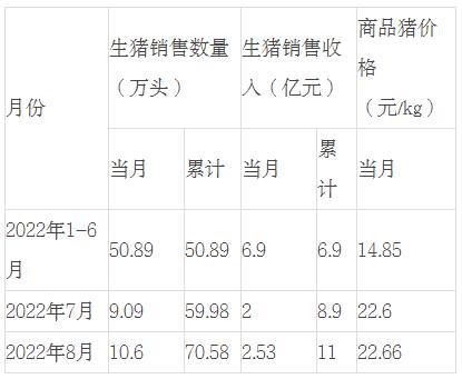 2022年1-8月,公司累計(jì)銷售生豬70.58萬頭(其中仔豬11.72萬頭),累計(jì)銷售收入11.43億元。