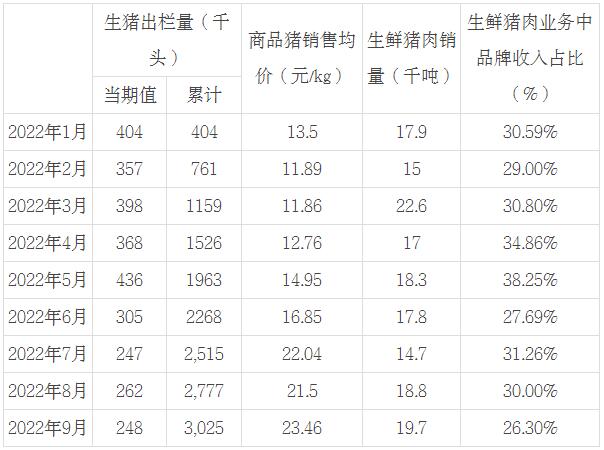 2022年1-9月,公司累計銷售生豬302.5萬頭。