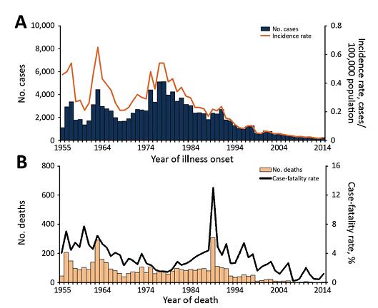 炭疽曾經(jīng)在我國廣泛流行,年度發(fā)病數(shù)千人,死亡上百人,90年代之后得到有效控制,疫情逐年下降,但仍在部分地區(qū)點狀、散發(fā)流行。下圖展示了從有記錄以來中國疫控中心總結(jié)的炭疽人員感染發(fā)病和死亡情況(Li Y, et al. Emerg Infect Dis, 2017)。