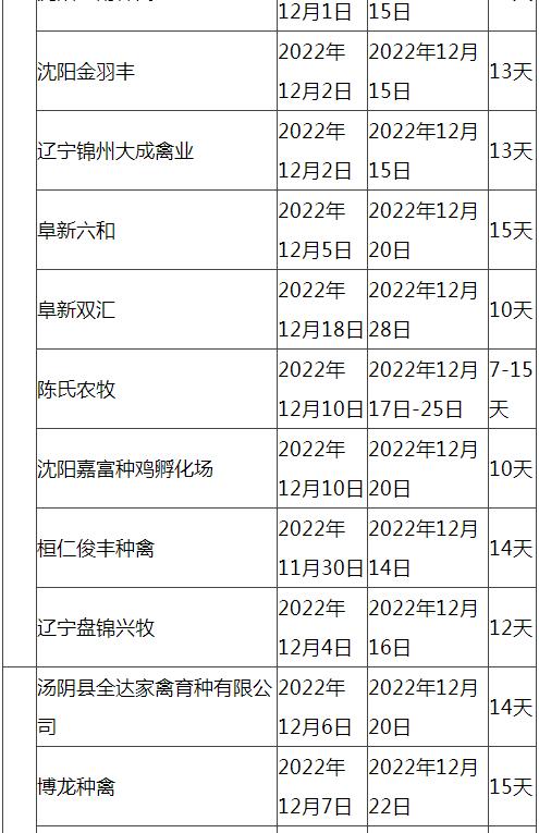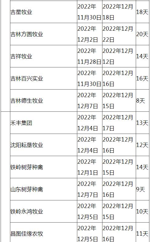 根據市場調研情況顯示,本次停苗時間最長在20天左右,最短7天左右,主要集中在12月上旬進行停止出苗(即屠宰企業(yè)農歷臘月二十三左右停止宰殺),12月15日-20日進行恢復出苗(即屠宰企業(yè)農歷2023年正月初八左右春節(jié)過后開工)。