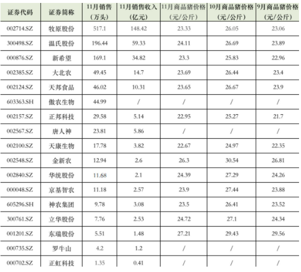 上市豬企11月銷售數(shù)據(jù)。數(shù)據(jù)來源:各上市豬企11月銷售簡(jiǎn)報(bào)