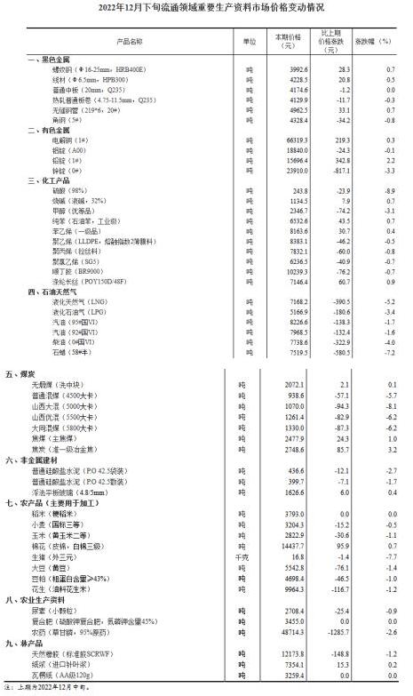 1月4日,國家統(tǒng)計局網(wǎng)站公布2022年12月下旬流通領(lǐng)域重要生產(chǎn)資料市場價格變動情況,據(jù)對全國流通領(lǐng)域9大類50種重要生產(chǎn)資料市場價格的監(jiān)測顯示,2022年12月下旬與12月中旬相比,15種產(chǎn)品價格上漲,31種下降,4種持平。其中,生豬(外三元)價格為16.8元/千克,環(huán)比下降7.7%。