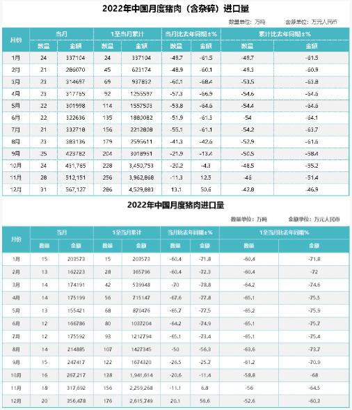 12月份豬肉進口略有起色,含雜碎進口量31萬噸,環(huán)比上漲3萬噸,同比上漲13.1%;進口額567127萬元,同比上漲50.6%。