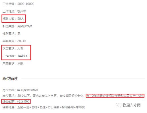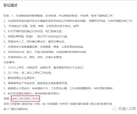 招聘生豬養(yǎng)殖業(yè)管理干部10人,青睞具備牧原、溫氏等頭部企業(yè)5年以上繁殖、育肥工作經(jīng)驗(yàn)的求職者,工作地在浦東新區(qū),結(jié)合標(biāo)出的待遇是2萬(wàn)以上,看起來(lái)雖然名義上是干部卻也能對(duì)標(biāo)場(chǎng)長(zhǎng)職級(jí)。
