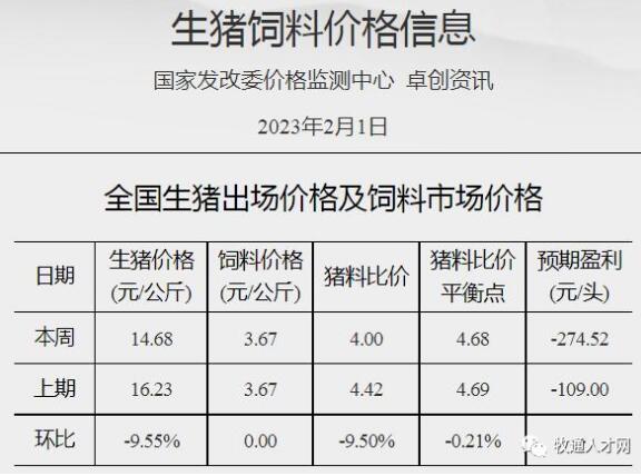 另據(jù)國(guó)家發(fā)改委價(jià)格監(jiān)測(cè)中心網(wǎng)站消息,截至2023年2月1日當(dāng)周,全國(guó)豬料比價(jià)為4.00,較春節(jié)前(1月18日)下降9.50%。按目前價(jià)格及成本推算,未來生豬養(yǎng)殖頭均虧損為274.52元。