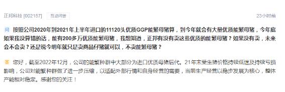 正邦科技2月6日在回復投資者提問時表示,截至2022年12月,公司的能繁種群中大部分為進口優(yōu)質(zhì)母豬后代。21年末受生豬價格持續(xù)低迷及持續(xù)虧損影響,公司對能繁種群做了進一步壓縮,以適配外部行情和自身經(jīng)營的需要,當前生產(chǎn)經(jīng)營以穩(wěn)步發(fā)展為核心,整體產(chǎn)能相對穩(wěn)定。