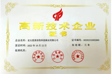 ??日前,據(jù)高新技術(shù)企業(yè)認(rèn)定管理工作網(wǎng)相關(guān)公告,亞太星原農(nóng)牧科技海安有限公司(以下簡(jiǎn)稱(chēng):亞太星原)順利通過(guò)每3年一次的高新技術(shù)企業(yè)重新認(rèn)定,正式收到由江蘇省科學(xué)技術(shù)廳、江蘇省財(cái)政廳、國(guó)家稅務(wù)總局江蘇省稅務(wù)局聯(lián)合頒發(fā)的《高新技術(shù)企業(yè)證書(shū)》(證書(shū)編號(hào):GR202232002860)。這一“國(guó)字號(hào)”榮譽(yù)在亞太星原的成功延續(xù),意味著亞太星原在研發(fā)創(chuàng)新等方面的實(shí)力得到了社會(huì)各界的持續(xù)性高度認(rèn)可。