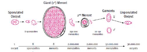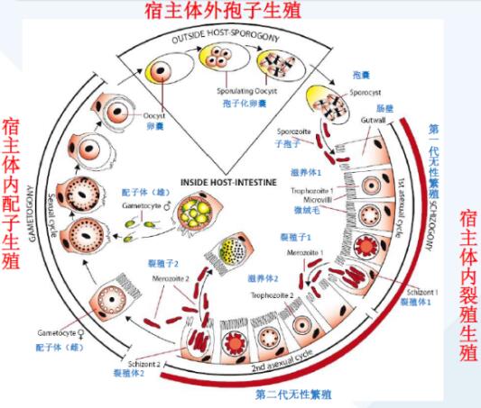 整個(gè)循環(huán)中體內(nèi)的增殖階段需要多少天呢?因?yàn)椴煌蛳x(chóng)種類(lèi)的感染性卵囊從被食入體內(nèi)到排出新的卵囊的周期不一樣,平均是21天。體外的生殖階段時(shí)間不確定,溫度越高、濕度越大,從非感染性到感染性卵囊時(shí)間就相對(duì)較短,可能1-2天,甚至1天。