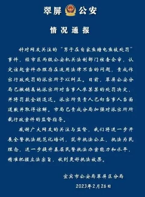 針對(duì)網(wǎng)友關(guān)注的“男子在自家魚塘電魚被處罰”事件,經(jīng)市區(qū)兩級(jí)公安機(jī)關(guān)法制部門核查會(huì)審,認(rèn)定該起案件辦理存在適用法律不當(dāng)?shù)膯栴},責(zé)成作出行政處罰的派出所予以糾正。目前,翠屏公安分局已撤銷屬地派出所對(duì)當(dāng)事人廖某某的處罰決定,并將罰款全額退還。派出所負(fù)責(zé)人已向當(dāng)事人當(dāng)面道歉并取得諒解。市局已責(zé)成分局加強(qiáng)對(duì)派出所所裁行政案件的監(jiān)督指導(dǎo)。