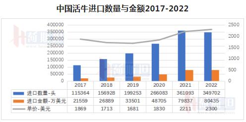 2022全年進(jìn)口活牛34.97萬頭,同比去年36.11萬頭減少3%,活牛到岸價平均2300美元/頭,同比去年上漲4%。
