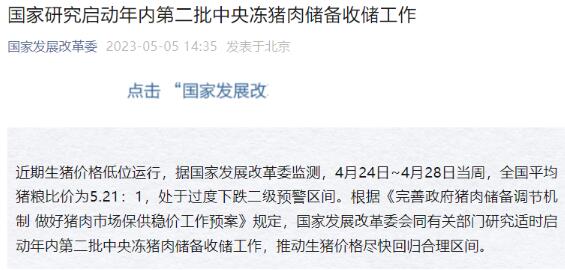 近期生豬價(jià)格低位運(yùn)行,據(jù)國家發(fā)展改革委監(jiān)測,4月24日~4月28日當(dāng)周,全國平均豬糧比價(jià)為5.21:1,處于過度下跌二級(jí)預(yù)警區(qū)間。根據(jù)《完善政府豬肉儲(chǔ)備調(diào)節(jié)機(jī)制 做好豬肉市場保供穩(wěn)價(jià)工作預(yù)案》規(guī)定,國家發(fā)展改革委會(huì)同有關(guān)部門研究適時(shí)啟動(dòng)年內(nèi)第二批中央凍豬肉儲(chǔ)備收儲(chǔ)工作,推動(dòng)生豬價(jià)格盡快回歸合理區(qū)間。