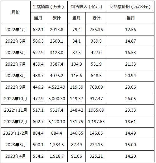 牧原股份5月6日公布2023年4月份生豬銷售簡報。2023年4月份,公司銷售生豬534.2萬頭(其中商品豬519.2萬頭,仔豬13.0萬頭,種豬2.0萬頭),銷售收入91.06億元。其中向全資子公司牧原肉食品有限公司及其子公司合計銷售生豬103.3萬頭。