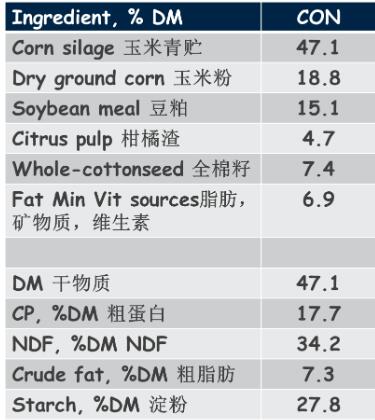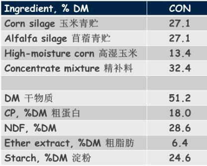 試驗(yàn)選用114頭多胎荷斯坦奶牛,這些牛進(jìn)入試驗(yàn)時(shí)是在泌乳第41天,所以是多批次納入。同時(shí),試驗(yàn)牛要接受Calan飼喂系統(tǒng)的使用訓(xùn)練。Calan飼喂系統(tǒng)預(yù)先給每頭牛制定了獨(dú)立飼喂門(mén),每頭??梢垣@得飼喂門(mén)里的飼料。牛在第一周要接受相關(guān)訓(xùn)練,適應(yīng)飼喂門(mén),然后是兩周的調(diào)整控制變量和13周的干預(yù)時(shí)間,這兩周的時(shí)間給奶牛飼喂同樣的基礎(chǔ)日糧,不進(jìn)行任何干預(yù),然后分析所有動(dòng)物的基礎(chǔ)指標(biāo),了解奶牛的生產(chǎn)性能,同時(shí)基于這些指標(biāo)進(jìn)行分析。為什么這兩周很重要?因?yàn)樵囼?yàn)可能分2-3組,一組在研究開(kāi)始前指標(biāo)就比另一組好,在研究結(jié)束時(shí)還是比其他組好,這樣不能確定指標(biāo)高是因?yàn)閯?dòng)物本身的因素還是牛經(jīng)過(guò)了干預(yù)之后性能更好了?所以調(diào)整控制變量的兩周特別重要。