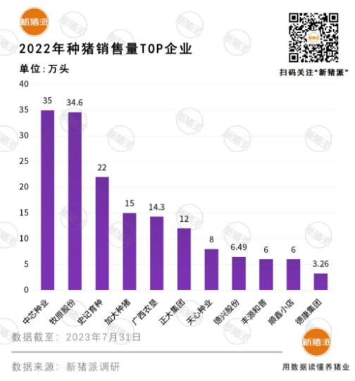 根據(jù)新豬派調(diào)研,2022年種豬銷售TOP10企業(yè)分別是中芯種業(yè)、牧原、史記、加大、廣西農(nóng)墾、正大等企業(yè),合計(jì)銷量為162.65萬頭。