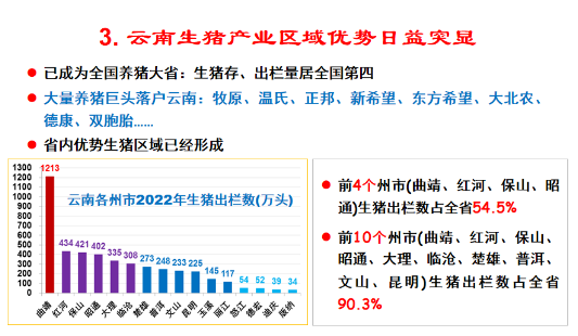 其三,云南生豬產業(yè)區(qū)域優(yōu)勢日益凸顯。云南生豬存欄、出欄量居全國第四,牧原、溫氏、正邦、新希望、東方希望、大北農、德康、雙胞胎等大量養(yǎng)豬巨頭落戶云南,且省內優(yōu)勢生豬區(qū)域已經形成。數據顯示,曲靖、紅河、保山、昭通四大州市生豬出欄量占全省54.5%,加上大理、臨滄、楚雄、普洱、文山、昆明合計十大州市全年出欄量占云南省的90.3%。