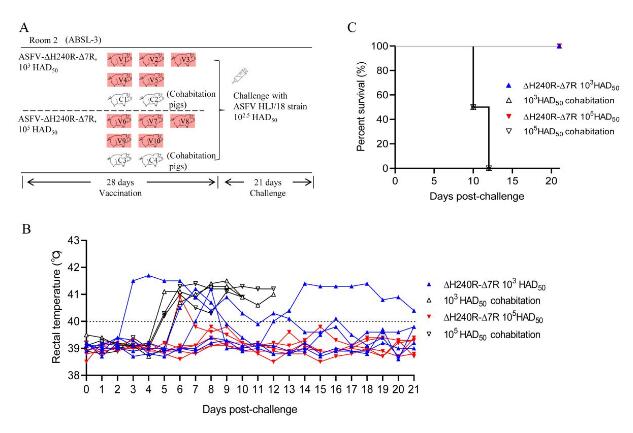 非洲豬瘟是由非洲豬瘟病毒引起的一種急性、高致死性傳染病,給世界養(yǎng)豬業(yè)造成了嚴重的經(jīng)濟損失。由于病毒的致病機制不清楚,而且缺乏安全、高效的疫苗和特效藥物,非洲豬瘟的防控形勢依然嚴峻。哈獸研相關(guān)團隊在前期鑒定好的兩個與非洲豬瘟病毒致病力密切相關(guān)的基因MGF505-7R(PLoS Pathog,2021)和H240R(J Virol,2023)基礎(chǔ)上,本研究以非洲豬瘟病毒HLJ/18為親本株,同時敲除H240R和MGF505-7R基因,獲得一個雙基因缺失毒株(ASFV-ΔH240R-Δ7R)。