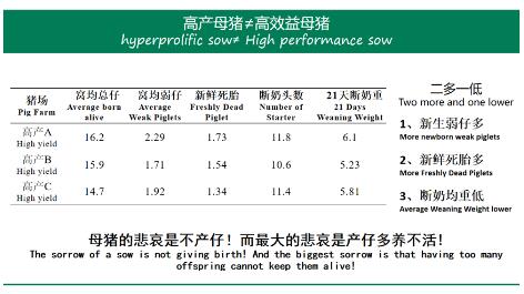 余奎老師認(rèn)為高產(chǎn)母豬≠高效益母豬,現(xiàn)在高產(chǎn)母豬無法變成高效益母豬主要是有三個瓶頸的限制,即“兩多一低”,①新生弱仔多;②新鮮死胎多;③斷奶均重低。余奎老師提出“母豬的悲哀是不產(chǎn)仔!而最大的悲哀是產(chǎn)仔多養(yǎng)不活!”。所以針對高繁母豬三個限制性的問題,余奎老師也是進(jìn)行相應(yīng)的課題研究。
