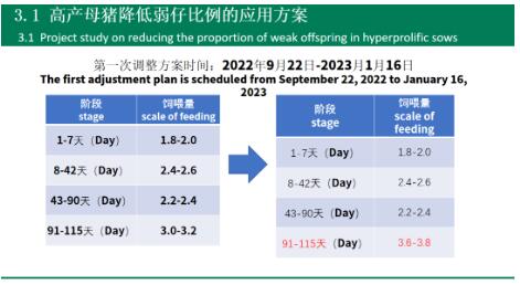 2023年9月-1月進(jìn)行了第一次飼喂方案調(diào)整:母妊娠后期91天-115天,增加料量0.6kg/頭/天,試驗結(jié)果顯示窩均弱仔下降0.5頭,發(fā)現(xiàn)沒有完全解決母豬產(chǎn)弱仔問題。