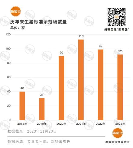 2018年開啟畜禽養(yǎng)殖標(biāo)準化示范場新標(biāo)準以來,生豬示范場每年的數(shù)量經(jīng)歷了快速增長期,2021年達到峰值113家,此后開始平穩(wěn)下降,生豬示范場在總數(shù)中占比穩(wěn)定在48%。