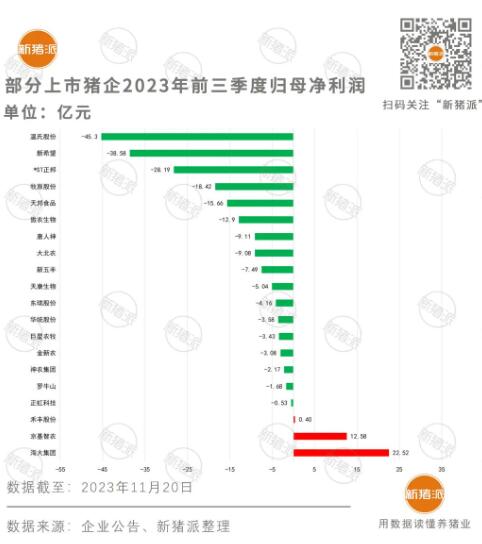 據(jù)新豬派統(tǒng)計(jì),2023年前三季度,20家上市豬企有17家歸母凈利潤(rùn)虧損,合計(jì)虧損額達(dá)208.4億元。聚焦在第三季度,亦大同小異,僅海大、牧原、溫氏、禾豐、神農(nóng)、巨星6家實(shí)現(xiàn)盈利,其余14家歸母凈利潤(rùn)虧損。