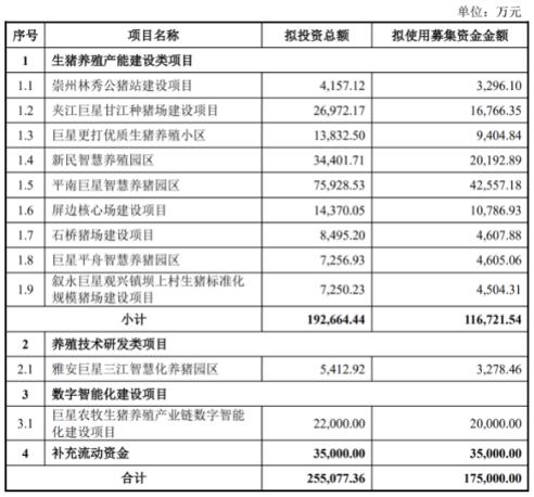 項目可行性分析報告顯示,上述募投項目中的生豬養(yǎng)殖產能建設類項目包含九個子項目,擬投資總額19.27億元,擬投入募集資金11.67億元。